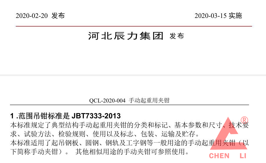 辰力鋼板起重鉗企業標準:范圍吊鉗標準是 JBT7333-2013_了解起重鉗_新聞動態_起重鉗,鋼板起重鉗,吊裝鉗,鋼板鉗,起重吊裝鉗-辰力集團有限公司