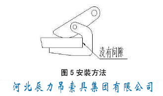 4.2   實(shí)際使用時(shí),鋼板與地面應(yīng)留有間隙,間隙的大小應(yīng)略大于吊鉗底部的厚度。手動(dòng)搬開(kāi)橫鉗的鉗舌至***大開(kāi)口;把橫鉗卡在鋼板上,以鋼板的一邊接觸到橫鉗的內(nèi)側(cè)面為準(zhǔn)。起吊前應(yīng)檢查,鋼板的重心應(yīng)位于兩組吊鉗組成多邊形的中心上。吊起鋼板后,鋼板應(yīng)水平,當(dāng)鋼板與水平面夾角大于7°時(shí),則應(yīng)重新調(diào)整橫鉗位置。尤其注意沒(méi)有橫梁的情況,此時(shí)鋼板與水平面夾角不得大于5°,否則必須重新安裝。